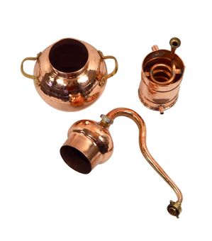 Handgeschmiedete Kupferdestille mit montiertem Destillierthermometer in der ursprünglichen Alembik Bauform für aromastarke Destillate. Mit der Alembik werden Hydrolate direkt aus dem Kessel destilliert – ohne Aromasieb.
