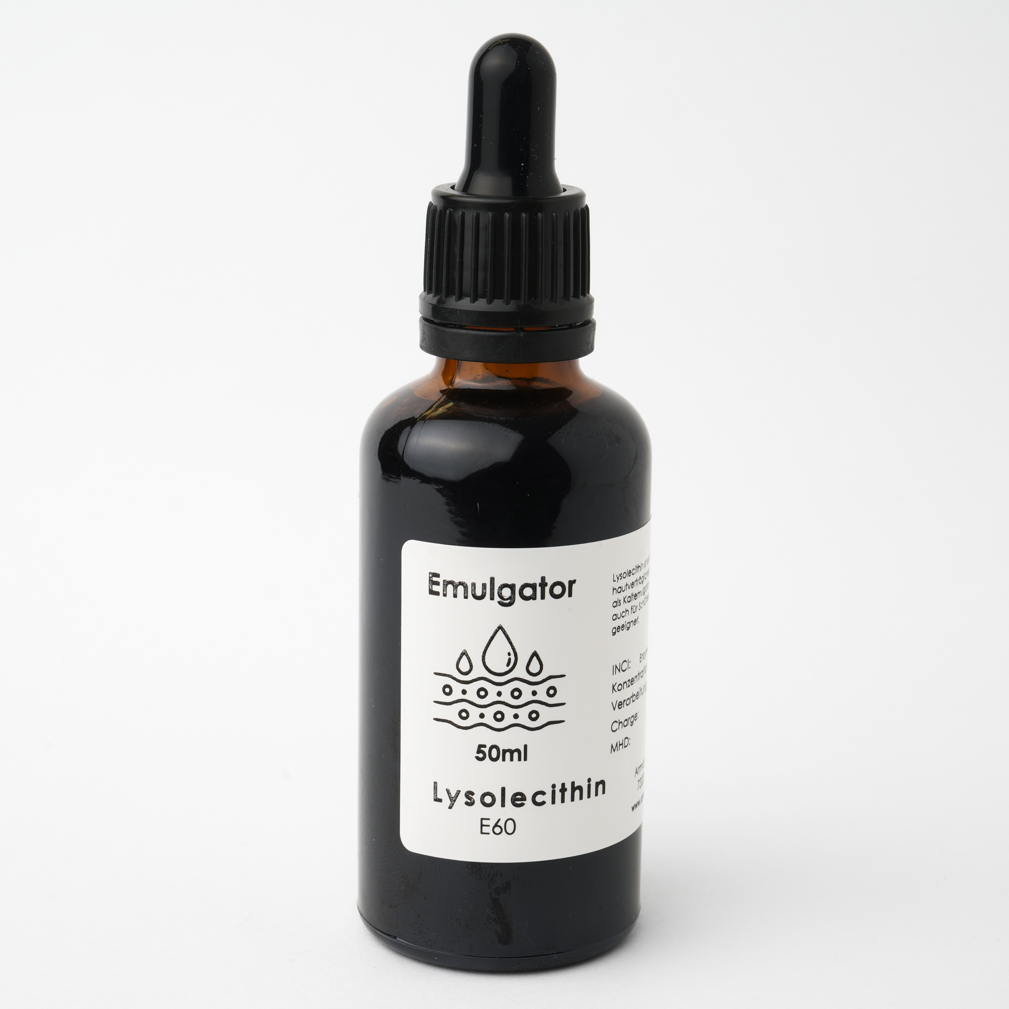Das gelb-braune, sirupartige Lysolecithin ist ein durch enzymatische Verändreung aufbereitetes Lecithin, wodurch die Wasserlöslichkeit erhöht wird. Der Phosphatidylcholingehalt liegt bei 15%. Lysolecithin ist ein Mischemulgator, der sowohl O/W- als auch W/O-Emulsionen erzeugen kann. Er ist für heiss- und kaltgerührte Emulsionen einsetzbar und kann, wie Fluidlecithin Super, auch in einer fertigen Emulsion nachdosiert werden. Lysolecithin ist ein sehr leistungsfähiger Emulgator, der für ein breites Fettpahsenspektrum von 18 bis 70% einsetzbar ist, wobei der die besten Ergebnisse im Bereich von 20 bis 45% Fettphase liefert. Bei der Verarbeitung sollten einige Besonderheiten beachtet werden. Lysolecithin bringt von sich aus keine Konsistenz mit. Deshalb sollte der Anteil an Butter, Wachs und/oder Gelbildner gelöst werden. Die Emulsionen erhalten, bedingt durch die dunkle Farbe, einen leichten Vanilleton. Sie sind zunächst sehr flüssig und benötigen ein bis zwei Tage, bis sie die endgültige Konsistenz erreichen. Als sinnvoll hat sich erwiesen, die Creme während dieser Reifezeit einige Male umzurühren bzw. die Lotionflasche zu schütteln. Emulsionen mit Lysolecithin zeichnen sich durch das angenehme Hautgefühl nach dem Auftragen, schnelles Einziehverhalten und gute Verträglichkeit aus. In Mischungen mit anderen Emulgatoren vermindert Lysolecithin die Viskosität der Emulsion. Dies ist besonders bei der Herstellung von Lotionen oder sprühbaren Formulierungen intressant. Lysolecithin kann auch als Emulgator für Badeöle verwendet werden. Der intensive Geruch des Lecitins ist jedoch schwer mit Duftstoffen zu überdecken. Nach einiger Zeit setzt sich Lysolecithin am Flaschenboden ab. Dies kann durch kurzes Schütteln der Flasche schnell behoben werden.