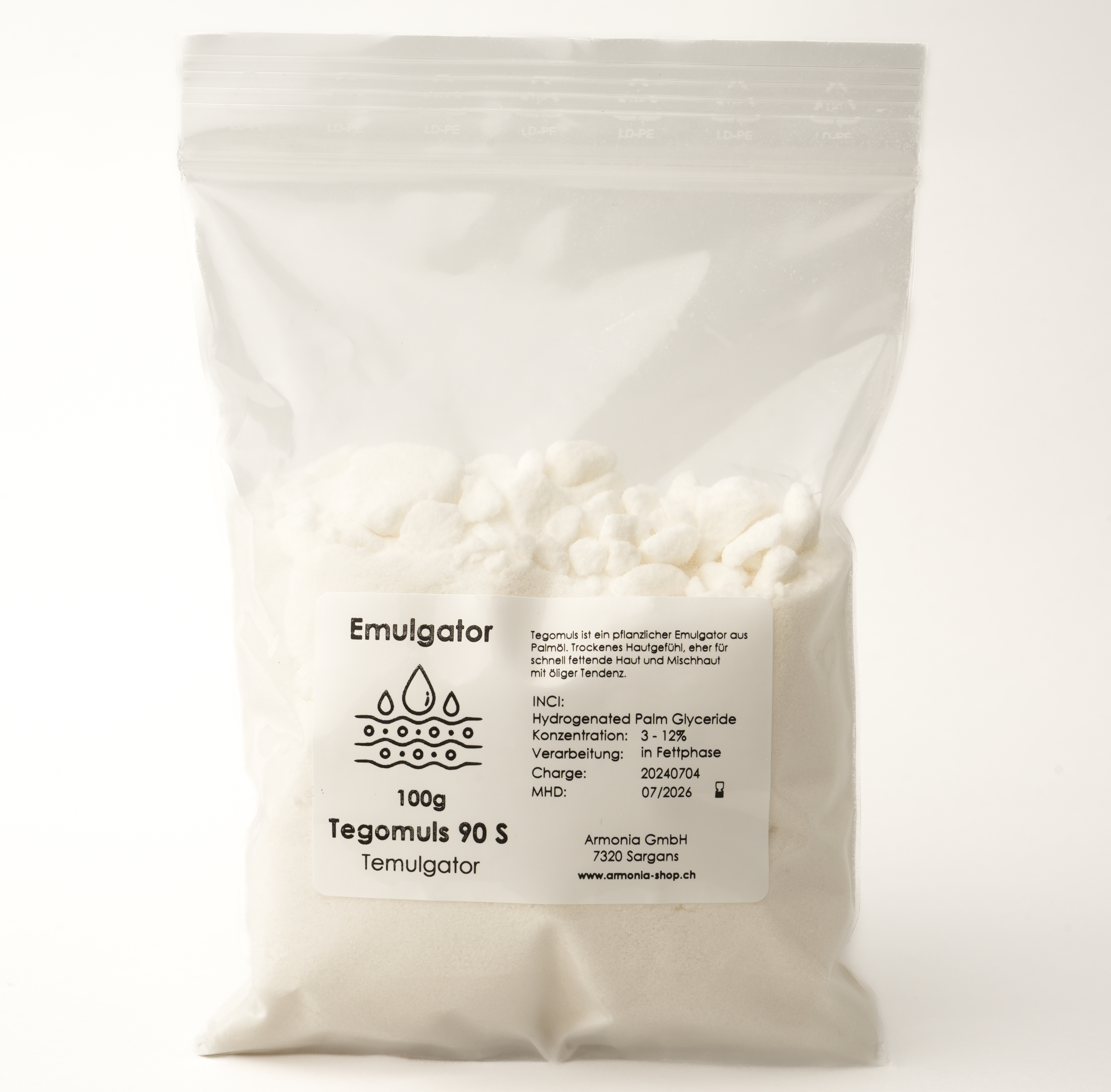 Tegomuls 90 S ist ein Emulgator, der ursprünglich für die Lebensmittelindustrie entwickelt wurde. Er wird als Emulgator und Aufschlaghilfe für Margarine, Kuchen, Speiseeis, Brot usw. verwendet. Seine Vorzüge im Lebensmittelbereich liegen in seiner Fähigkeit, Gebäck länger frisch zu halten und luftige Ergebnisse zu erzeugen. Durch die Sendung Hobbythek wurde Tegomuls 90 S als Emulgator zur Herstellung von Hautcremes bekannt. Er basiert auf Stearinsäure aus Palmöl. In verschiedenen Datenblättern wird der Emulgator als destilliertes Monoglycerid aus vollständig gehärtetem Palmöl beschrieben. Tegomuls 90 S setzt sich aus mind. 90 Prozent Monoglyceriden und ca. 5 Prozent Natriumstearat zusammen. Er kommt als fein granuliertes gelbliches Pulver in den Handel. Der Schmelzbereich liegt zwischen 62 und 66°C. Tegomuls 90 S ist ein O/W-Emulgator für Cremes und Lotionen mit 20 bis 35 Prozent Fettphase. Er erzeugt stabile Emulsionen, die jedoch im unteren Fettphasenbereich zum Wässern neigen. Das heisst, dass die Emulsion bei Auftrag bricht und ein wässriges Gefühl auf der Haut erzeugt. Etwas Cetylpalmitat und Xanthan stabilisiert die Emulsion zusätzlich, sie sollten daher immer eingeplant werden. Tegomuls tolieriet keine Säure- und Salzzugaben. Im sauren pH-Bereich wird die Emulsion instabil werden. Beachten Sie, das für Cremes mit Tegomuls 90 S wegen des höheren pH-Wertes nicht alle Konservierungsstoffe verwendet werden können. Tegomuls 90 S erzeugt leichte, mattierende Emulsionen, die schnell einziehen und nicht nachfetten. Er vermittelt eher trockenes Hautgefühl, daher ist er ein guter Emulgator für junge Haut, schnell fettende Haut und Mischhaut mit öliger Tendenz. Auch für nicht fettende Hand- und Frusscremes bildet er eine geeignete Grundlage. Ein weiterer Nachteil ist seine Neigung zum Weisseln. Das heisst, dass vor allem Lotionen bei grossflächigem Verreiben einen hartnäckigen weissen Film erzeugen. Dieses kleine Probelm löst sich von selbst, wenn man der Lotion drei bis fünf Tage Ruhezeit gönnt. Möchten Sie leichte, schnell einziehende Cremes mit säurehaltigen Wirkstoffen und/oder Salzen konzipieren, kombinieren Sie Tegomuls im Verhältnis 2:1 mit einem anderen Emulgator Ihrer Wahl.