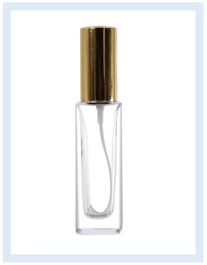 Mini Parfümzerstäuber im edlen Vintagelook - quadratische Form mit goldener Kappe. Die Zerstäuberpumpe ist weiss. Füllmenge 8ml.