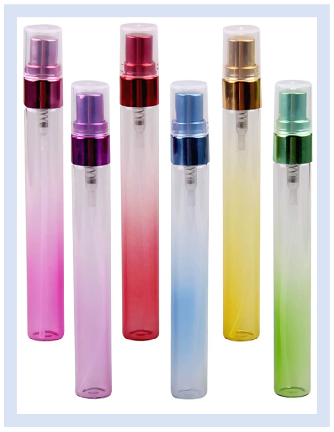 Bunte Zerstäuber aus Glas mit Kunststoffdeckel in verschiedenen Farben erhältlich. Grösse: 11.5 cm Länge und 1.3 cm Breite.